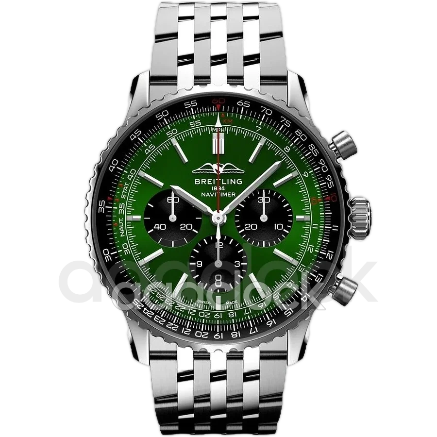 Breitling Navitimer B01 Chronograph 46 AB0137241L1A1 - это роскошные часы из коллекции Navitimer, созданные Breitling и изготовленные в соответствии с высочайшими стандартами качества. Циферблат зеленый, посеребренные малые циферблаты. Малые часовые метки и полированные, мечевидные стрелки, покрытые люминесцентным составом Super LumiNova С1. Счетчики хронографа и малой секундной стрелки. Дополняет образ двунаправленный вращающийся безель, с логарифмической линейкой.